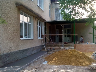 Параллельно строители реконструируют центральный вход в детский сад. Парадный вход существенно расширен, готова конструкция для установки пандуса, обустроен навес. Остались заключительные работы по установке тротуарной плитки, перилл.