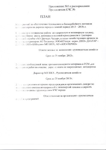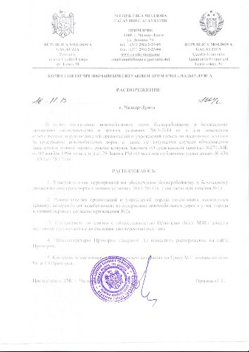 В целях подготовки автомобильных дорог к бесперебойному и безопасному движению автотранспорта в зимних условиях 2013-2014 гг. и для повышения ответственности руководителей организаций и учреждений города по подготовке техники для содержания автомобильных дорог, а также в целях недопущения случаев обморожения населения в зимний период, руководствуясь Законом «О гражданской защите № 271-XIII от 9 ноября 1994 года, ст. 29 Закона РМ «О местном публичном управлении» № 436 XVI от 28.12.2006 г. Председатель комиссии по Чрезвычайным Ситуациям Примэрии г.Чадыр-Лунга, Орманжи Георгий издал распоряжение об утверждении плана мероприятий по обеспечению бесперебойного и безопасного движения автотранспорта.