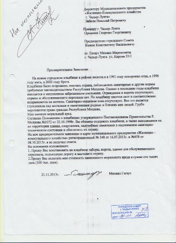 Проблема с состоянием кладбища вновь поднята экспредседателем Городского Совета Гагауз М.М., который направил в адрес ОМПУ города предварительное заявление с требованием восстановить на кладбище заборы, ворота, здание, дорогу и выставить охрану, а также выплатить ему стоимость нанесенного морального вреда в размере 100 000 леев.
