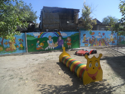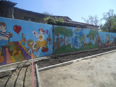 В детском саду установлен «веселый» забор из профнастила, со стороны соседства с частными домами установлены железобетонные плиты, которые с любовью разрисованы силами родителей.
