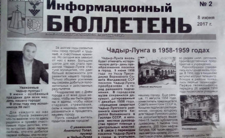 В Чадыр-Лунге вышел в свет второй выпуск Информационного бюллетеня, который был приурочен к празднованию Дня города. В данном номере представлена информация о деятельности примарии и городского Совета, а также подведомственных учреждений за пять месяцев 2017 года.